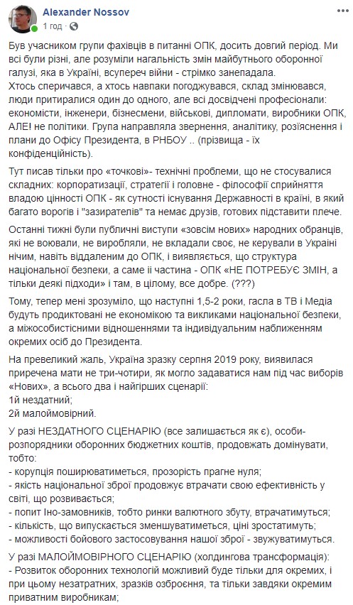 «Был участником группы специалистов в вопросе ОПК, достаточно долгий период. Мы все были разные, но понимали актуальность изменений будущего оборонной отрасли, которая в Украине, вопреки войне — стремительно приходила в упадок. Кто-то спорил, а кто-то наоборот соглашался, состав менялся, люди притирались друг к другу, но все опытные профессионалы: экономисты, инженеры, бизнесмены, военные, дипломаты, производители ОПК, НО! не политики. Группа направляла обращения, аналитику, розияснення и планы в Офис Президента в СНБОУ .. (фамилии — их конфиденциальность). Здесь писал только о «точечных» — технических проблемах, которые не касались сложных: корпоратизации, стратегии и главное — философии восприятия властью ценности ОПК — как сущности существования государственности в стране, у которой много врагов и нет друзей, готовых подставить плечо. Последние недели были публичные выступления «совершенно новых» народных избранников, которые не воевали, не создавали, не вкладывали свое, не руководили в Украине ничем, даже удаленным от ОПК, и оказывается, что структура национальной безопасности, а именно ее часть — ОПК «НЕ НУЖДАЕТСЯ В ПЕРЕМЕНАХ, а только некоторых подходов» и там, в целом, все хорошо. (???)», — заявил он.
