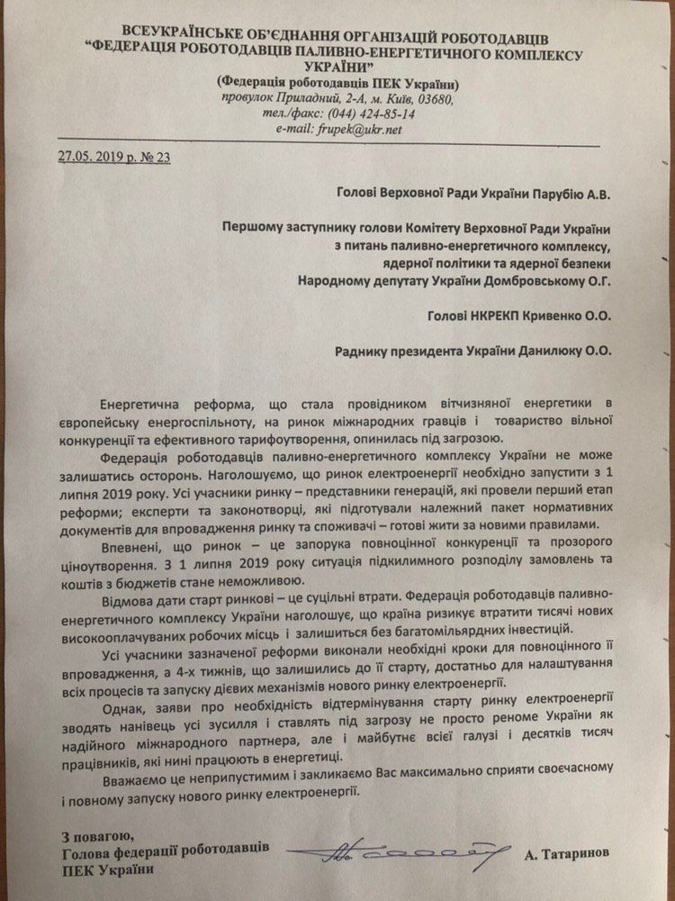Об этом говорится в обращении Федерации работодателей топливно-энергетического комплекса (ТЭК) Украины к руководству парламента, депутатам, председателю НКРЭКУ и советнику президента, сообщают «Українські новини».