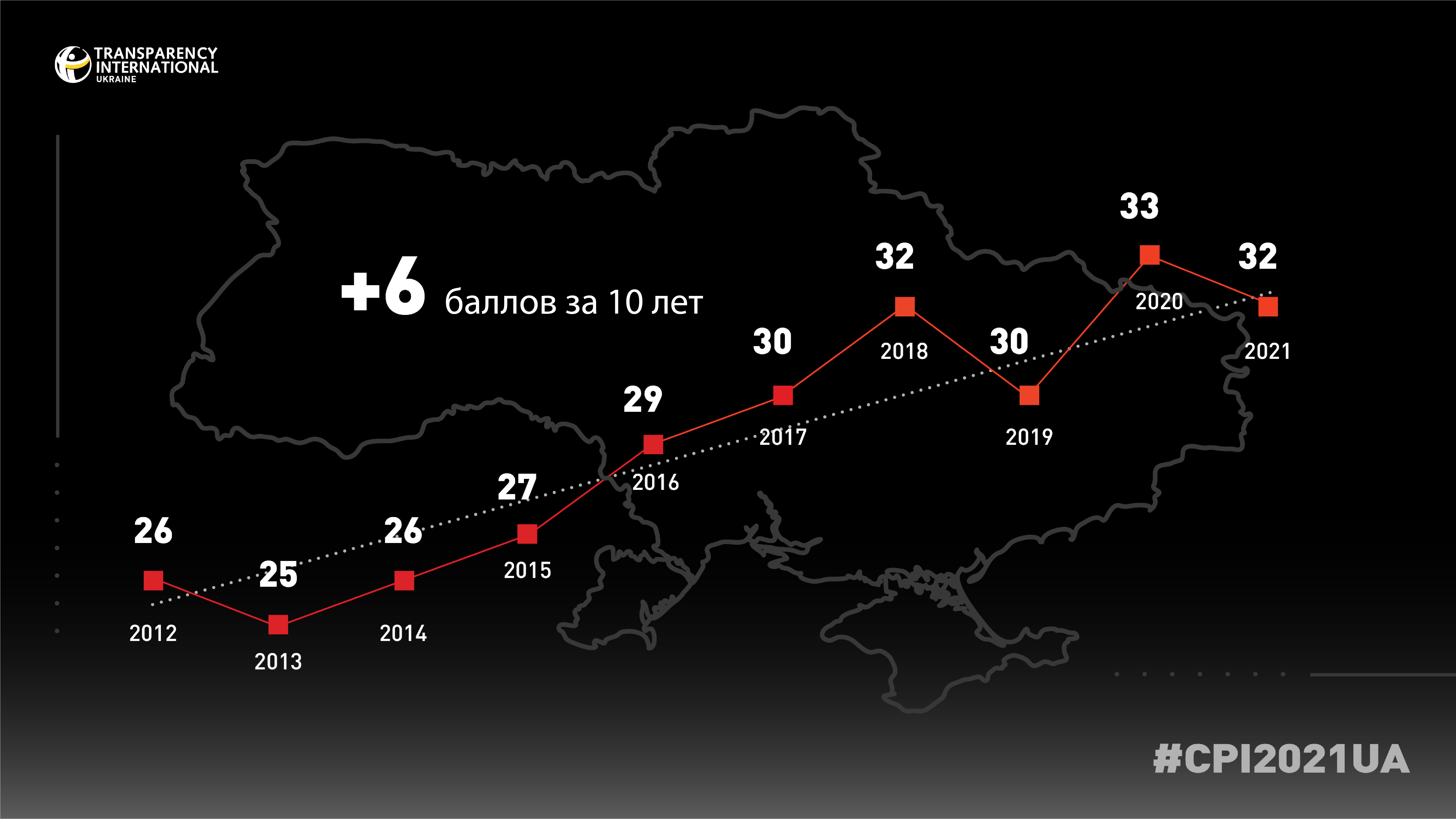 По результатам 2021 года, Украина потеряла один балл в ежегодном Индексе восприятия коррупции (Corruption Perceptions Index, CPI) от Transparency International. Грузия, Армения и Молдова до сих пор впереди.