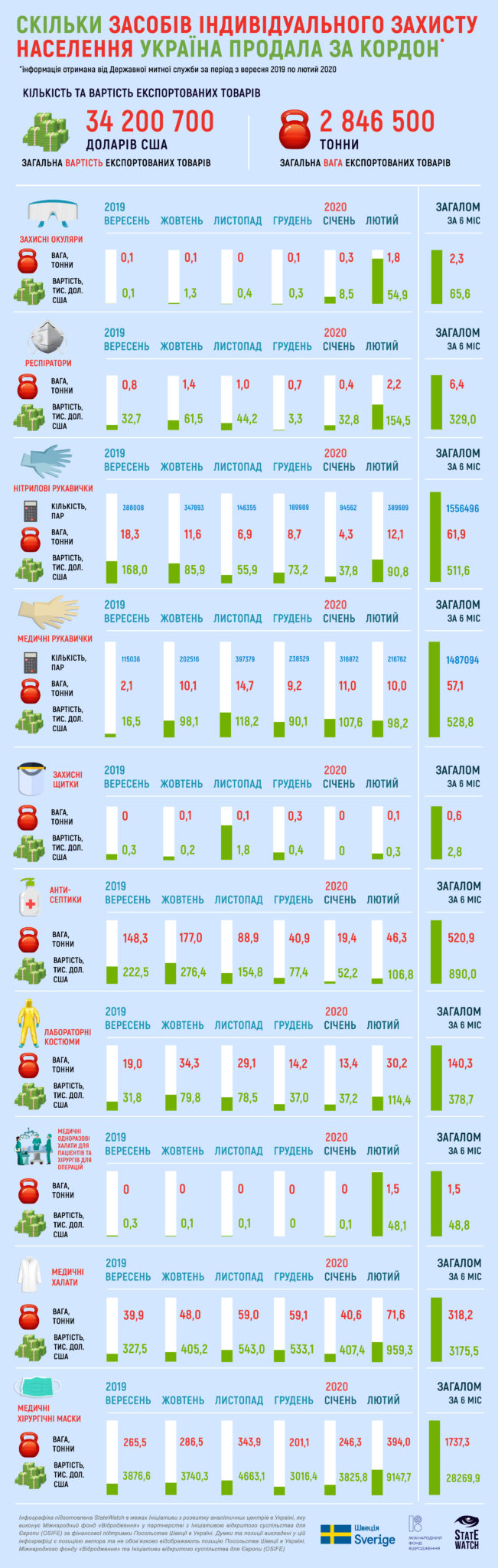 Всего за сентябрь 2019-го – февраль 2020 гг. из Украины экспортировали медицинских товаров для противодействия коронавирусу на 34,2 млн долларов США.