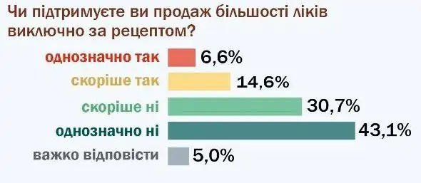 Абсолютное большинство опрошенных украинцев, а именно 43,1%, не поддерживают продажу большинства лекарств только по рецептам. Скорее нет, чем да ответили 30,7% граждан, а однозначно «за» выступили только 6,6% опрошенных.