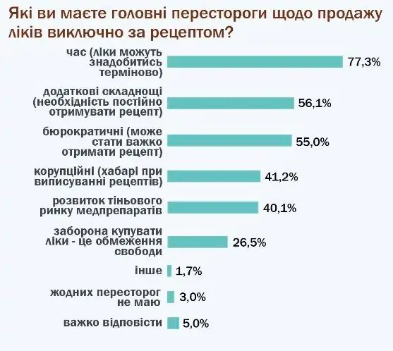 Среди главных предостережений по продаже лекарств исключительно по рецепту у украинцев на первом месте время — 77,3% респондентов ответили, что препарат может понадобиться срочно. Второе и третье место занимают дополнительные трудности и бюрократические задержки — по 56,1% и 55% соответственно.