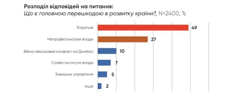 Главным препятствием для страны украинцы считают коррупцию (49%) и непрофессионализм власти (27%). А вот война перестала быть ключевым препятствием в массовом сознании — 10%. Об этом свидетельствуют данные исследования Украинского института будущего за период с 27.01.2021 года по 05.02.2021 года.