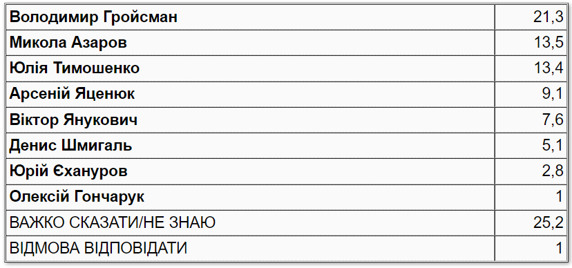 По мнению опрошенных, лучшим главой правительства Украины с 2005 года является Владимир Гройсман, которого поддерживают 21,3% респондентов. На втором месте Николай Азаров (13,5%), на третьем – Юлия Тимошенко (13,4%), на четвертом – Арсений Яценюк (9,1%), на пятом – Виктор Янукович (7,6%). Действующий премьер Денис Шмыгаль набрал 5,1%.