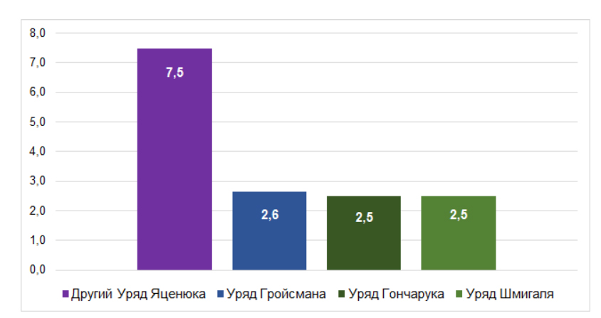Независимая аналитическая платформа Вокс Украина проанализировала эффективность разных премьер-министров с 2014 года и самым реформаторским оказалось второе правительство Арсения Яценюка. На втором месте правительство Гройсмана, потом идут Кабмины Гончарука и Шмыгаля. Аналитики отмечают, что Кабмин Яценюка установил реформаторский рекорд в конце марта-начале апреля 2015 г.