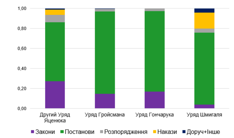 Правительство Яценюка смогло принимать реформы, используя различные инструменты, в частности значительная часть была проведена через законы в Раде. А вот другие правительства значительно меньше использовали этот инструмент даже несмотря на то, что в 2019-2020 годах президент, парламент и правительство фактически были представителями одной политической силы и имели шансы быстро принимать законы.