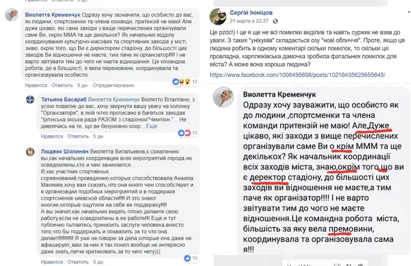 Пользователи соцсети Facebook поймали депутатку на безграмотности. В 2019 году беременную руководительницу стадиона “Чемпион” Анжелу Макееву уволили, по ее словам, за нежелание агитировать за Порошенко. Макеева написала об этом пост в соцсетях. Под ним Виолетта оставила комментарий с большим количеством орфографических ошибок.