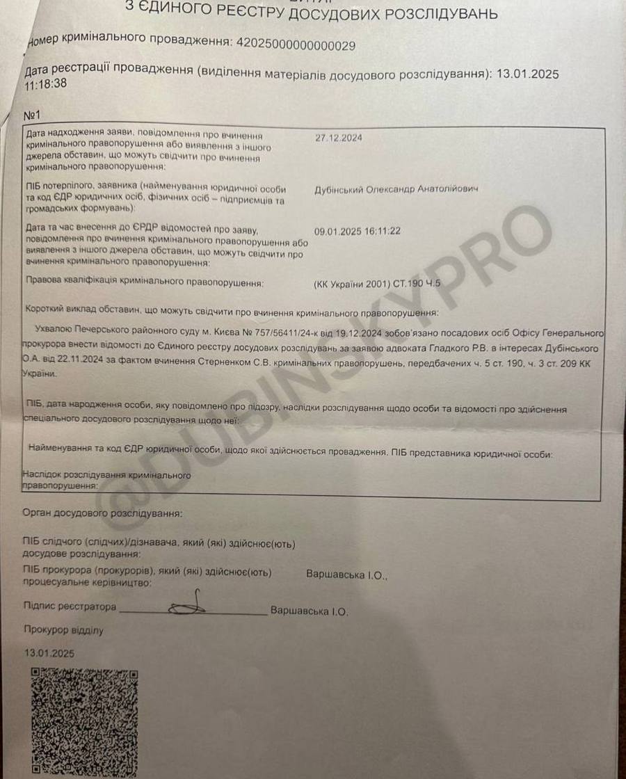 13 января 2025 года Офис Генерального прокурора возбудил против украинского общественного деятеля и волонтера Сергея Стерненко уголовное дело.