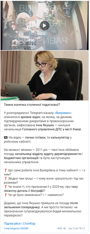 В распоряжении Telegram-канала «Обличитель» оказалось архивное видео, где, по данным правоохранителей, снята нынешняя начальница налогового Киева Инна Якушко в кабинете с пачками наличных денег.