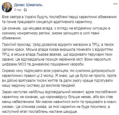 «Уже завтра в Украине будут ослаблены первые карантинные ограничения и начнет работать концепция адаптивного карантина. Это означает, что местные власти, учитывая эпидемическую ситуацию в каждом конкретном регионе, смогут оставлять в силе определенные ограничения», — отметил он.