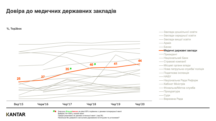Согласно данным результатам, по состоянию на июнь текущего года медицинским государственным учреждениям доверяют 44% респондентов (против 25% в сентябре 2015 года).