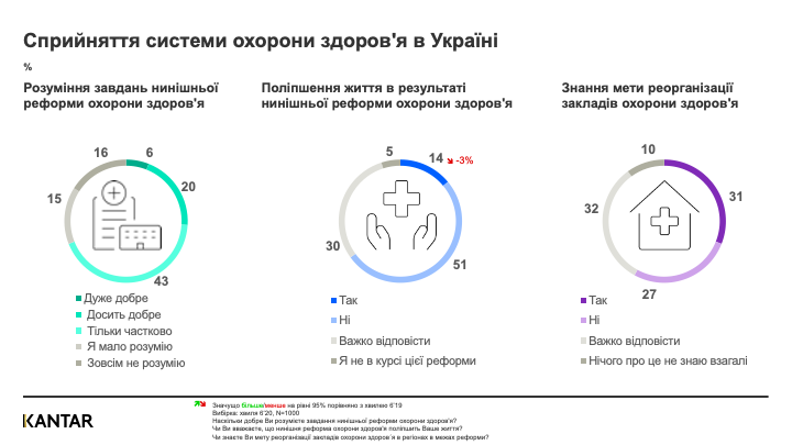 Задания реформы здравоохранения понимают 63% опрошенных (43% – очень хорошо, 20% – довольно хорошо), отсутствует понимание в той или иной степени у 31% (15% – мало понимают, 16% – не понимают вообще). И 6% понимают задачи реформы лишь частично.