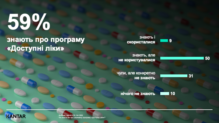 Большинство опрошенных знают о программе “Доступные лекарства”: 9% знают и воспользовались программой, 50% – знают, но не воспользовались ею. 31% опрошенных слышали о программе, но конкретно не знают. 10% ничего не знают о данной программе. Жители Киева и юга чаще выборки в целом ничего не слышали о программе вообще (18% и 17% против 10%).