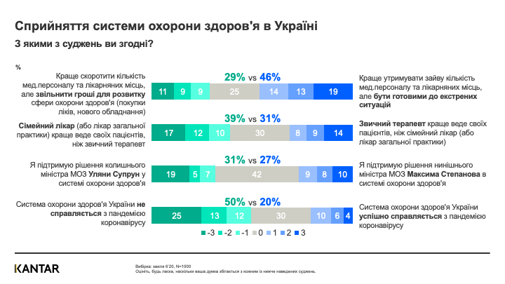 Респондентам было предложено выбрать, чьи решения в системе здравоохранения они поддерживают больше – бывшего министра здравоохранения Ульяны Супрун или нынешнего министра здравоохранения Максима Степанова. 42% выбрали нейтральную позицию, 31% поддержали Ульяну Супрун, 27% – Максима Степанова.
