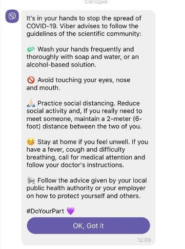 Viber разослал своим пользователям сообщения с рекомендациями и мерами предосторожности для защиты от COVID-19