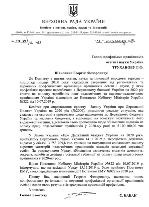 Кабінет Міністрів 15 листопада ухвалив рішення, яким передбачено зупинення на 2020 рік дії постанови КМУ № 822, яка передбачала підвищення заробітних плат освітян. Про це повідомив голова профільного парламентського комітету Сергій Бабак у відповідь на запит Профспілки працівників освіти і науки.