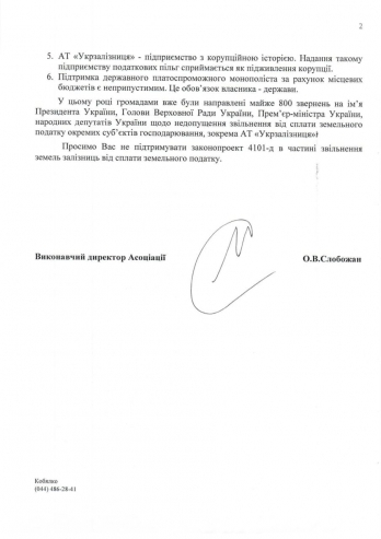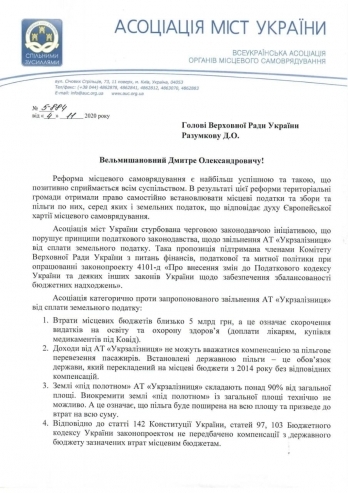 Ассоциация городов Украины обратилась к Председателю Верховной Рады Украины Дмитрия Разумкова, председателей профильных парламентских комитетов и председателей депутатских фракций и групп с просьбой не поддерживать законопроект №4101-д в части освобождения земель железных дорог от уплаты земельного налога. АГУ отмечает, что в результате реформы местного самоуправления территориальные общины получили право самостоятельно устанавливать местные налоги и сборы и льготы по ним, среди которых — земельный налог, что также соответствует духу Европейской хартии местного самоуправления.