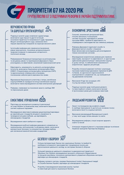 Послы G7 в Украине опубликовали план по поддержке реформ в Украине на 2020 год. Об этом говорится в инфографике на странице G7AmbReformUA в Twitter.