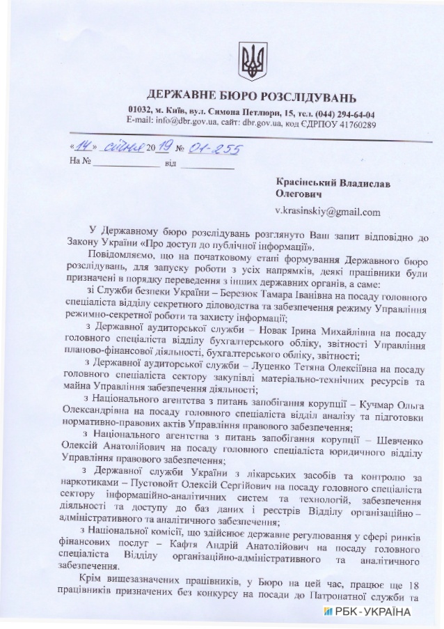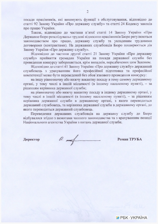 «Кроме вышеупомянутых работников, в бюро в настоящее время работает 18 сотрудников, назначенных без конкурса на должности в Патронатной службе и должности работников, выполняющих функции обслуживания, согласно ст.92 закона Украины «О государственной службе» и ст. 24 Кодекса законов о труде Украины», — говорится в ответе на запрос.