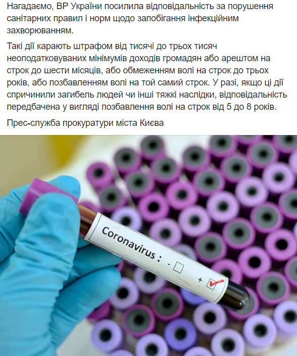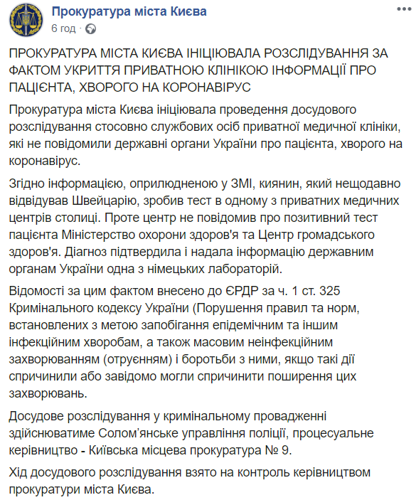 Прокуратура города Киева начала расследование по факту сокрытия частной клиникой информации о пациенте, заразившемся коронавирусом COVID-19