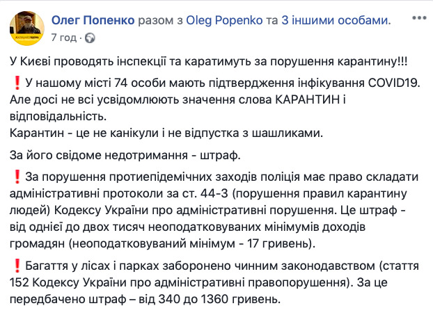 «В Киеве проводят инспекции и будут наказывать за нарушение карантина!!!» — написал он.