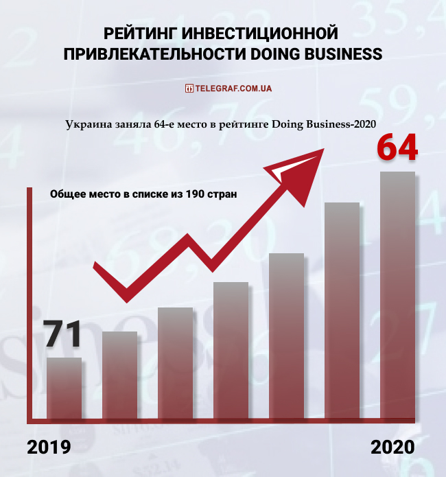 Рейтинг инвестиционной привлекательности Doing Business, ежегодно составляемый Всемирным банком, анализирует ситуацию в 190 странах мира, оценивая легкость ведения бизнеса в каждой их них. В рейтинге-2020 Украине удалось подняться сразу на 7 позиций и занять 64 место.
