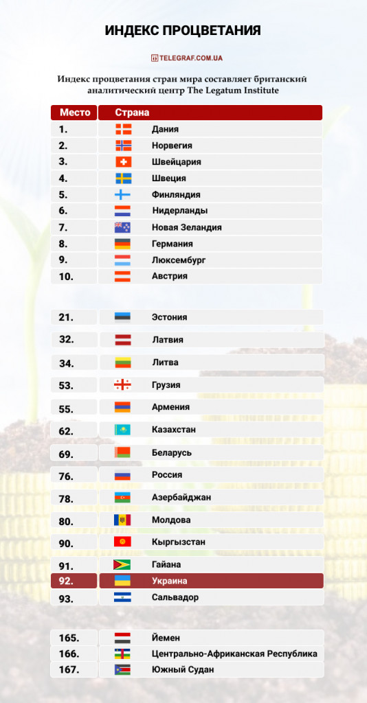 Украина в списке из 167 стран, опубликованном в конце 2020-го, заняла 92 строчку, между Гайаной и Сальвадором. Поскольку эта позиция в списке нам мало о чем говорит, для понимания ситуации отметим, как в данном рейтинге разместились другие постсоветские страны, «процветание» в которых 30 лет назад было примерно одинаковым.