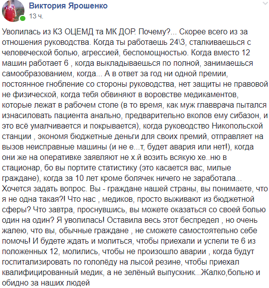 19 декабря в Никополе медработники планируют выйти на митинг возле горсовета. Коллеги и горожане поддержали Викторию Ярошенко, которая уволилась из службы скорой помощи