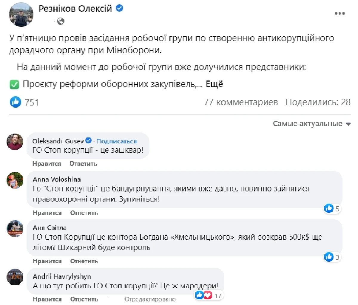 Министр сообщил, что «подготовительную работу поручено обеспечить государственному секретарю», и что «вызовов много». Резников перечислил организации, которые «подключились к рабочей группе по созданию антикоррупционного совещательного органа». Однако общественность возмутил тот факт, что организации (судя по словам Резникова) сами «подключились к работе», и что никто не разбирался, кто конкретно намерен быть в совещательном органе министерства. В частности, особенное возмущение вызвала организация «Стоп коррупции». Как выяснилось, это общественная организация некоего Богдана Хмельницкого, которого многие люди вспомнили по цветистому уголовному прошлому.