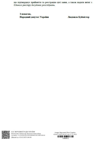 Народный депутат Людмила Буймистер обратилась к Генеральному прокурору Андрею Костину с заявлением, в котором призвала открыть в отношении народного депутата Марьяны Безуглой уголовное дело. Соответствующий документ опубликовал портал Цензор.нет 27 ноября.