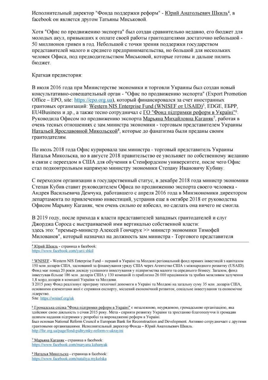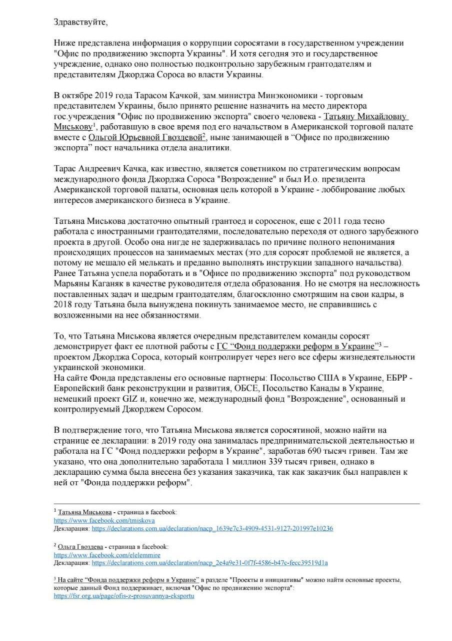 В документах сказано, что в октябре 2019 года замминистра экономики Тарас Качка назначил директором Офиса по продвижению экспорта Татьяну Миськову. Она еще с 2011 года тесно работала с иностранными грантодателями. Еще одним фактом ее приверженность команде «соросят» называют ее плотную работу с Фондом поддержки реформ в Украине — проектом Джорджа Сороса, через который контролируются все сферы украинской экономики.