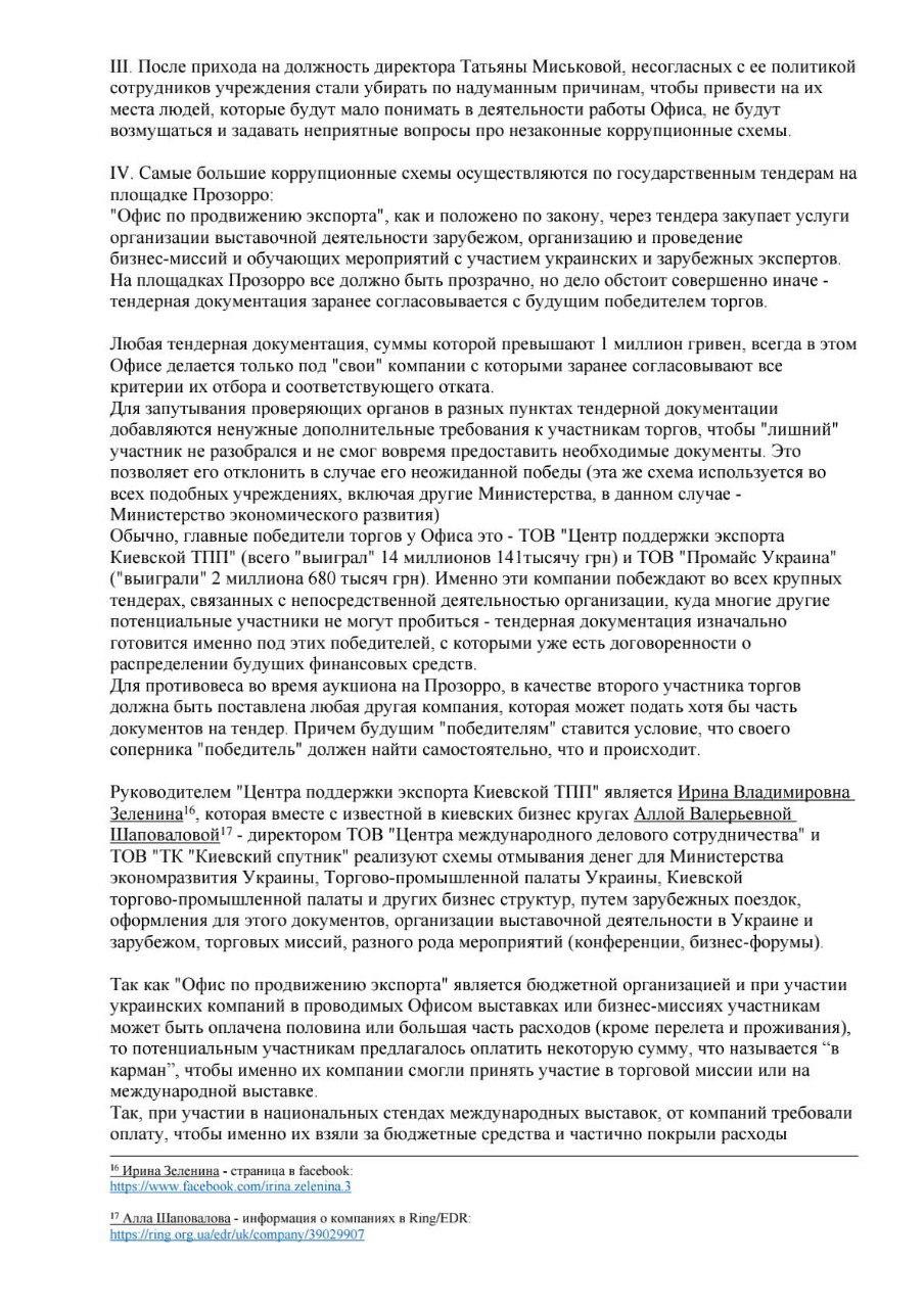 Также приводятся примеры из декларации Миськовой, где указаны большие зарплаты, но невозможно вычислить их происхождение. Бюджет Офиса по продвижению экспорта сравнительно невелик — 50 млн грн в год. Однако, по мнению автора письма, этого более чем достаточно для нескольких сотрудников офиса под предводительством Моськовой, которые и дальше пилят бюджет.
