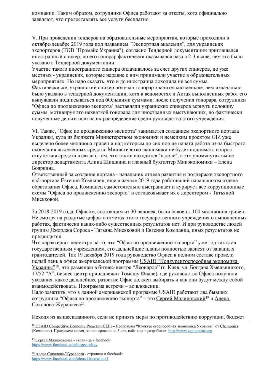 «Наш источник передал нам информацию о коррупционных схемах и злоупотреблениях соросят в структурах Министерства экономики Украины, а именно — Офисе по продвижению экспорта. Ниже мы приводим весь фактаж», — сказано в сообщении.