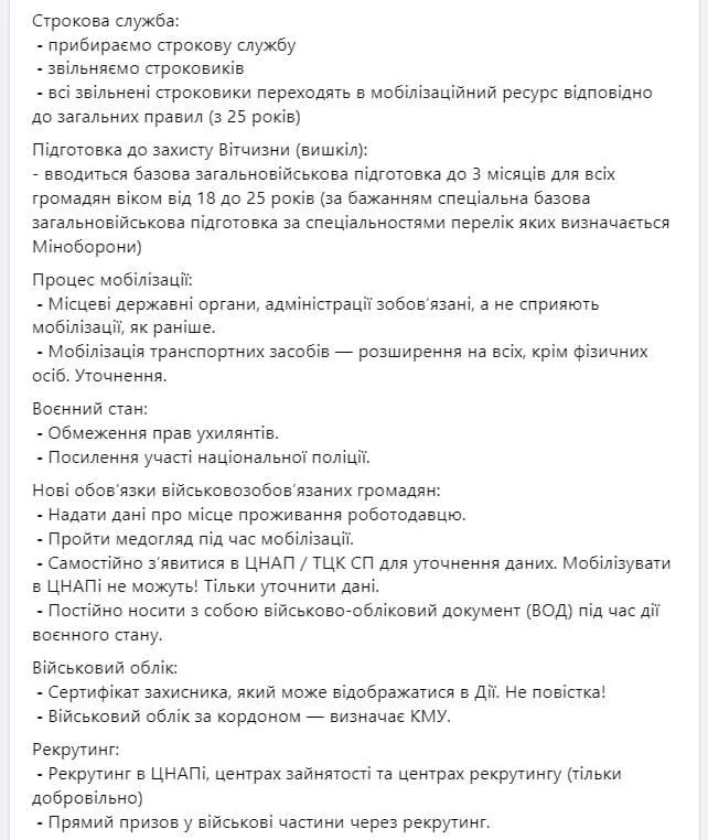 Будет действовать сертификат защитника, который может отображаться в Дие, а не повестка. Военный учет за границей — определяет КМУ. Рекрутинг будет проходить в ЦНАПе, центрах занятости и центрах рекрутинга (только добровольно). Прямой призыв в воинские части — через рекрутинг.