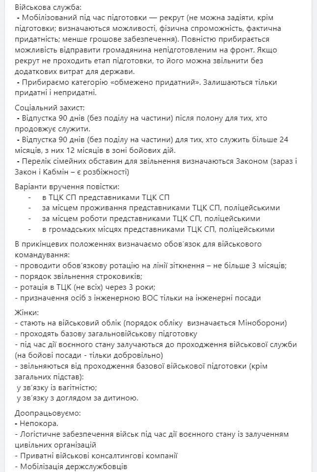 Военное командование будет обязано проводить обязательную ротацию на линии столкновения — не более 3 месяцев, определить порядок увольнения срочников. Ротация в ТЦК (не всех) через 3 года, назначать лиц с инженерной ВОС только на инженерные должности.