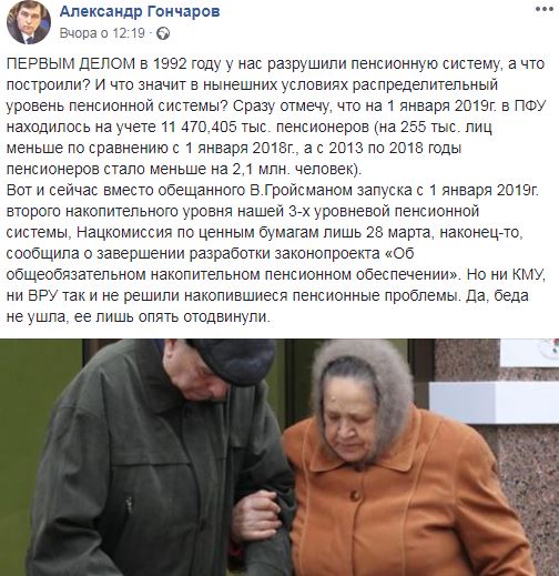 «На 1 января 2019г. в ПФУ находилось на учете 11 470,405 тыс. пенсионеров (на 255 тыс. лиц меньше по сравнению с 1 января 2018г., а с 2013 по 2018 годы пенсионеров стало меньше на 2,1 млн. человек)», — пишет эксперт. По его словам, сейчас национальная комиссия по ценным бумагам сообщает о завершении разработки законопроекта об общеобязательном накопительном пенсионном обеспечении. При этом несколько месяцев назад глава правительства Гройсман пообещал запустить с 1 января этого года второй накопительный уровень трехуровневой пенсионной системы. «Но ни КМУ, ни ВРУ так и не решили накопившиеся пенсионные проблемы. Да, беда не ушла, ее лишь опять отодвинули», — сообщил экономист.