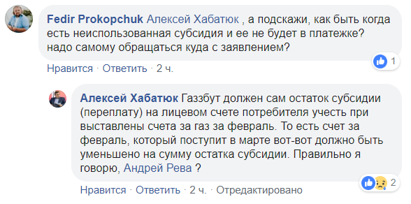 «Газзбут должен сам остаток субсидии (переплату) на лицевом счете потребителя учесть при выставлении счета за газ за февраль. То есть, счет за февраль, который поступит в марте, должен быть уменьшен на сумму остатка субсидии», – пояснил в комментарии заместитель начальника департамента энергоэффективности «Нафтогаза» Украины Алексей Хабатюк.