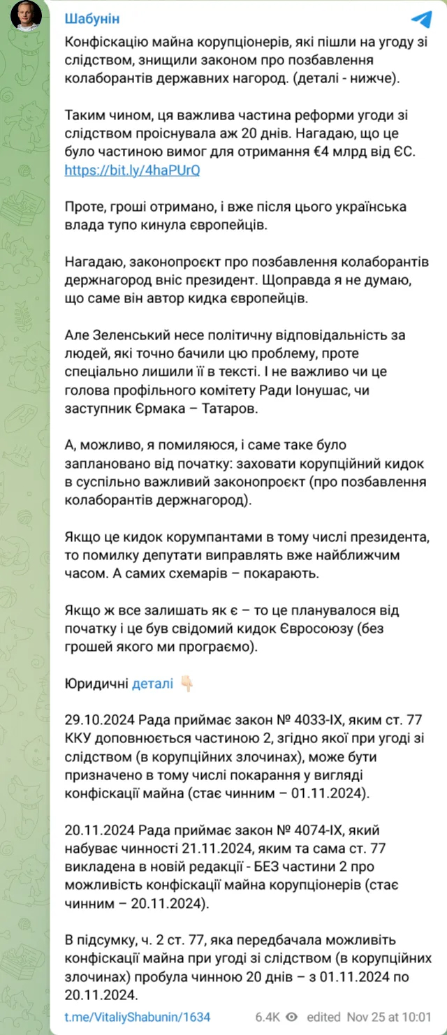 — 29 октбяря 2024 года нардепы приняли закон №4033-IX, которым ст. 77 Уголовного кодекса дополнялась частью 2, «согласно которой при соглашении со следствием (в коррупционных преступлениях), может быть назначено в том числе наказание в виде конфискации имущества». Закон вступил в силу 1 ноября.