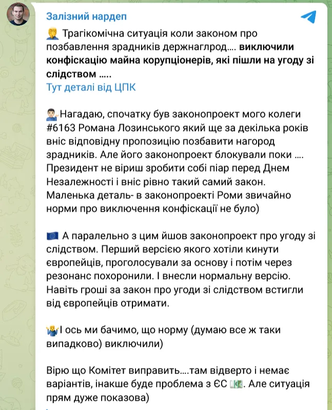 В свою очередь, нардеп Ярослав Железняк («Голос») отметил: произошедшее может оказаться случайностью, а потому это должно быть исправлено. Ведь «откровенно и нет вариантов, иначе будет проблема с ЕС».
