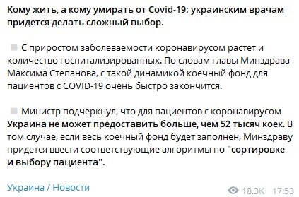 Министр подчеркнул, что для пациентов с коронавирусом Украина не может предоставить больше, чем 52 тысяч коек. В том случае, если весь коечный фонд будет заполнен, Минздраву придется ввести соответствующие алгоритмы по «сортировке и выбору пациента», — говорится на канале.