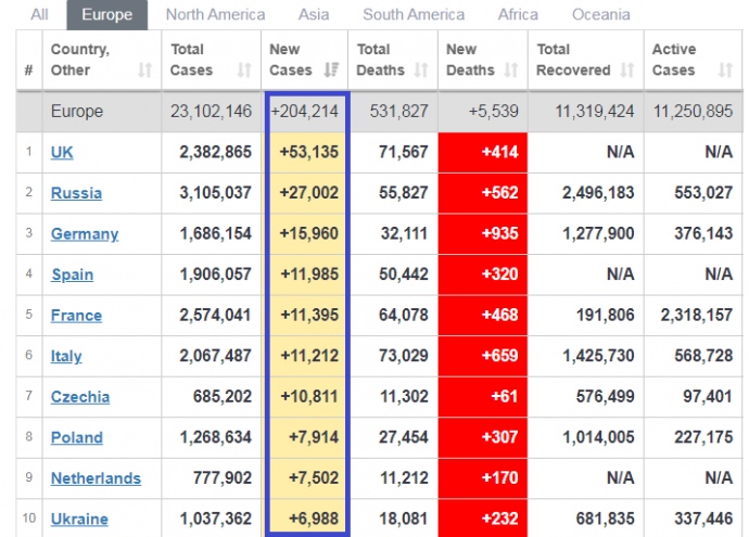 Детали: В странах Европы лидерами антирейтинга по количеству новых случаев COVID-19 является Великобритания, Германия, Испания, Франция, Италия, Чехия и Украина, которая занимает 10-ю позицию. В соответствующем мировом антирейтинге Украина на 19-м месте.