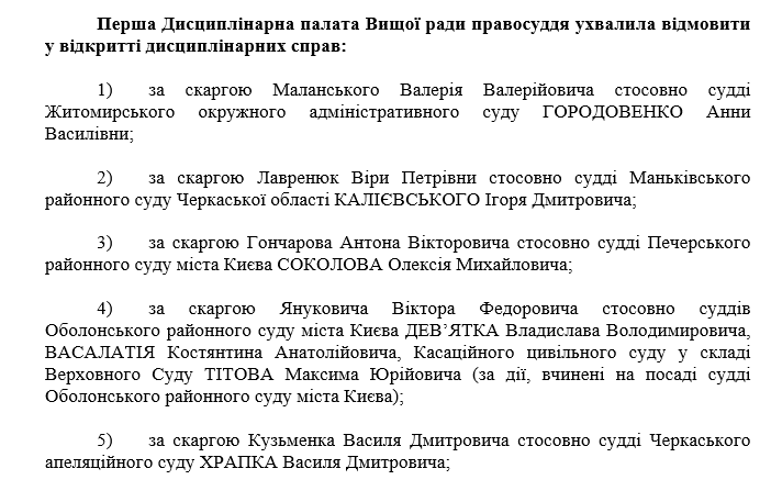 Первая дисциплинарная палата Высшего совета правосудия 7 февраля отказалась открыть дисциплинарное дело в отношении судей Оболонского районного суда Киева Владислава Девятко, Константина Васалатия и теперь уже судьи Кассационного гражданского суда в составе ВС Максима Титова.