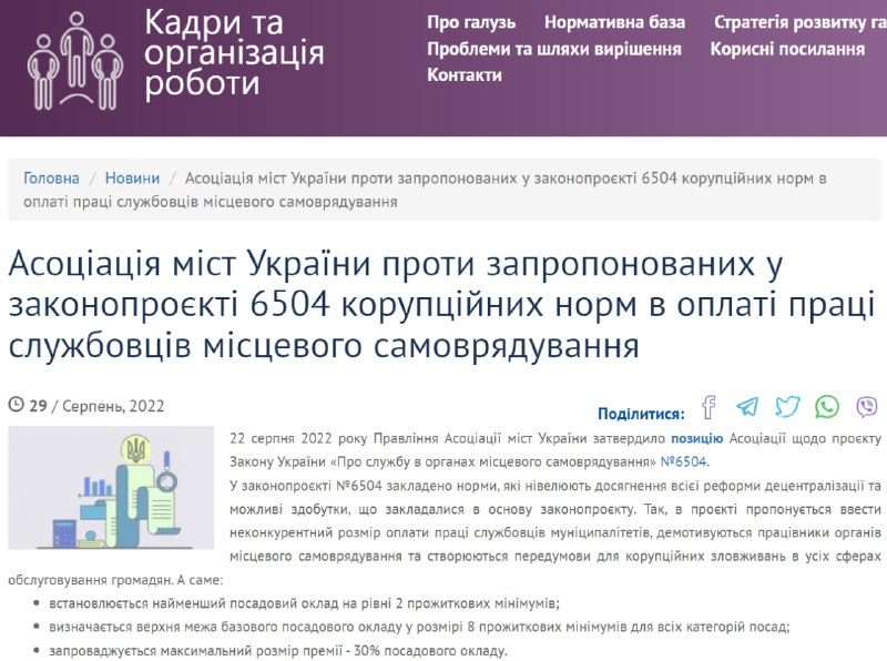 Ассоциация городов Украины увидела предпосылки для коррупции в законопроекте №6504, который должен ограничить зарплаты служащим местного самоуправления.