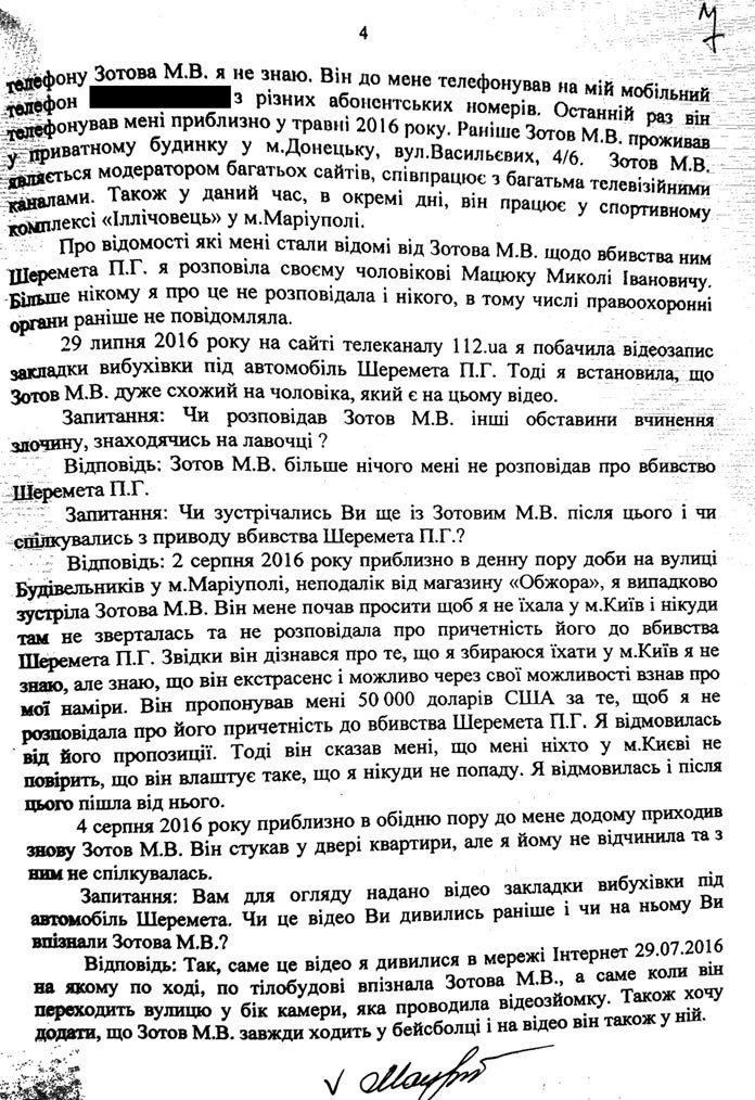 Мацюк отказывается общаться с прессой о Зотове. Однако редакция «Забороны» располагает копией ее показаний, которые называет «важным поворотом в деле убийства Павла Шеремета».