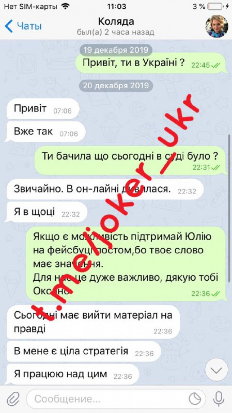 «Справа вбивства Шеремета. Поговорили від імені Корчинської з міністром з питань ветеранів АТО Оксаною Колядою. Міністр, як і Корчинська, попри волю президента Зеленського і позицію міністра внутрішніх справ Авакова не згодна із звинуваченнями, і хоче допомогти підозрюваним у вбивстві журналістів», – написав «Джокер».