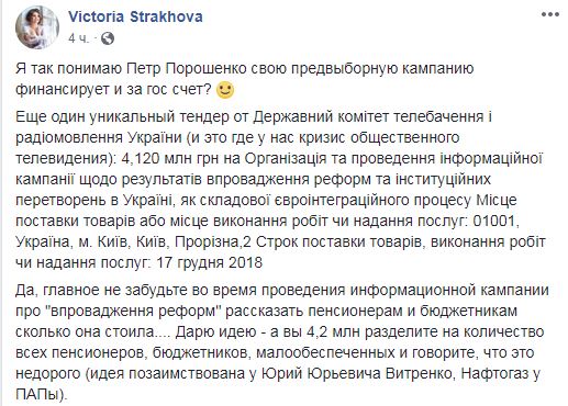 В соцсетях расценили эту закупку как то, что Порошенко хочет провести свою рекламную кампанию за государственный счет. «Да, главное не забудьте во время проведения информационной кампании про «впровадження реформ» рассказать пенсионерам и бюджетникам сколько она стоила…. Дарю идею — а вы 4,2 млн разделите на количество всех пенсионеров, бюджетников, малообеспеченных и говорите, что это недорого (идея позаимствована у Юрий Юрьевича Витренко, Нафтогаз у ПАПы)», — пишет в Facebook Виктория Страхова.