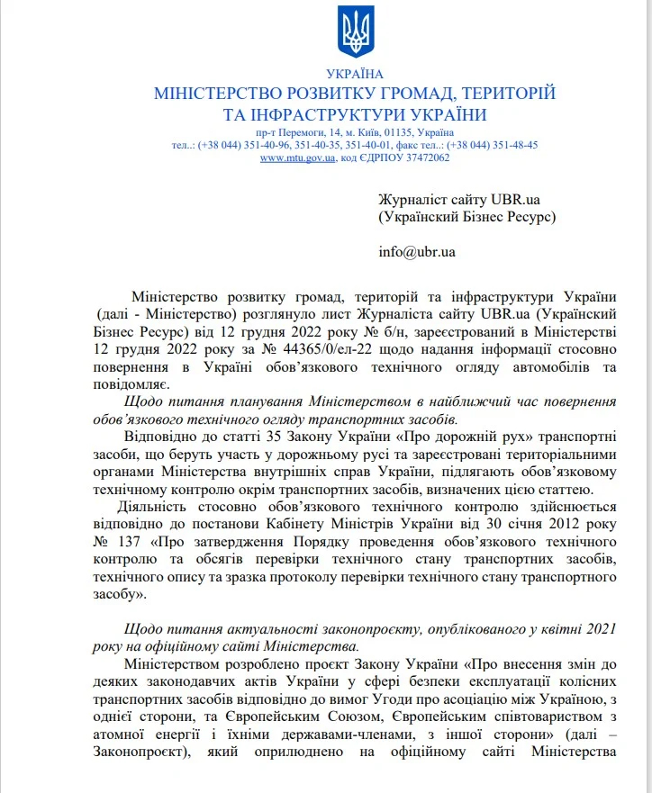За разъяснениями о том, есть ли реальные предпосылки для возвращения техосмотра уже в 2023 году, UBR.ua обратился с запросом в новосозданное Министерство развития общин, территорий и инфраструктуры (МОТИ) – ведомство, объединившее раннее обособленные Министерство регионального развития и Мининфраструктуры.