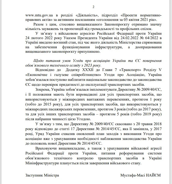 Как объясняется в ответе, подписанным замглавы МОТИ Мустафой-Маси Найемом, опубликованный в апреле 2021 года законопроект «получил значительное количество замечаний от общественности и профильных союзов». Его доработка на данный момент приостановлена в виду того, что во время военного положения деятельность ведомства должна быть сконцентрирована на обеспечении функционирования инфраструктуры.