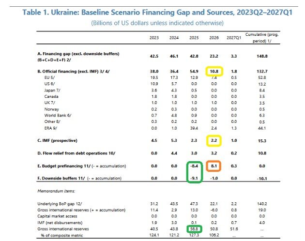 Но это означает что по плану МВФ, Украина сформирует 17.5 млрд долларов буфер для финансирования в 2025-м году и при этом Международные резервы вырастут до рекордных 56.8 млрд долларов (цифры зеленым цветом в Табл.1).