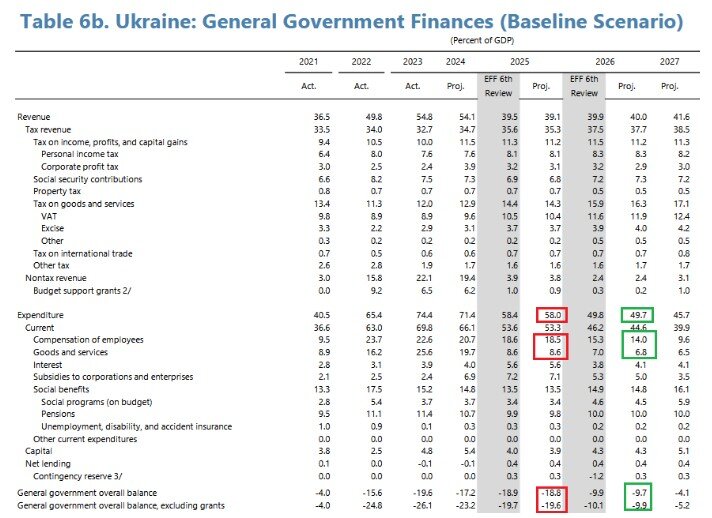 Что касается 2026-го года, то МВФ предполагает, что в случае окончания войны в 2025-м году (базовый сценарий), Украине потребуется 23.2 млрд финансирования, поскольку государственные расходы будут сокращены в первую очередь на выплату зарплат 1 млн армии и военных закупок товаров и услуг в переходной к режиму мирного времени год. А консолидированные расходы государства в 2026 году упадут с 58% ВВП до 49.7% ВВП. При этом дефицит бюджета снизится с 18.8 до 9.7% ВВП (смотри Табл.2)